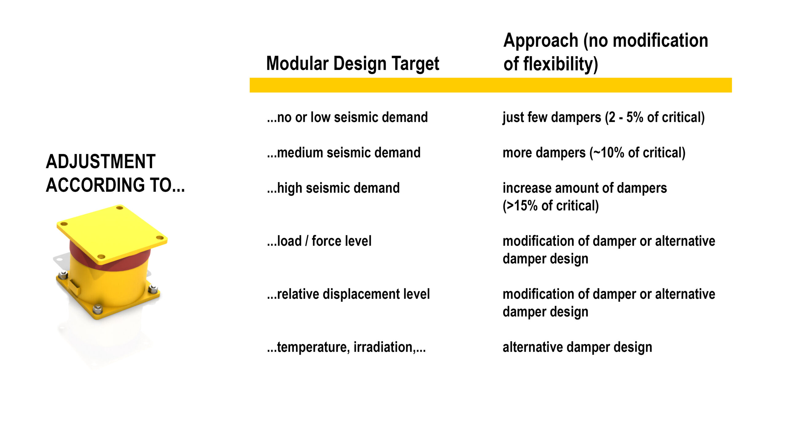 The Base Control System (BCS) consists of helical steel springs and highly efficient Viscodamper®, which are arranged underneath the structure. The system is flexible in horizontal directions, but possesses also a vertical elasticity. Viscodamper® supply absorption forces in horizontal and vertical directions. In particular the resulting demands (e.g. accelerations, base shear etc.) of the structure can be significantly reduced by using the BCS—due to reduction of frequencies and increase of structural damping.